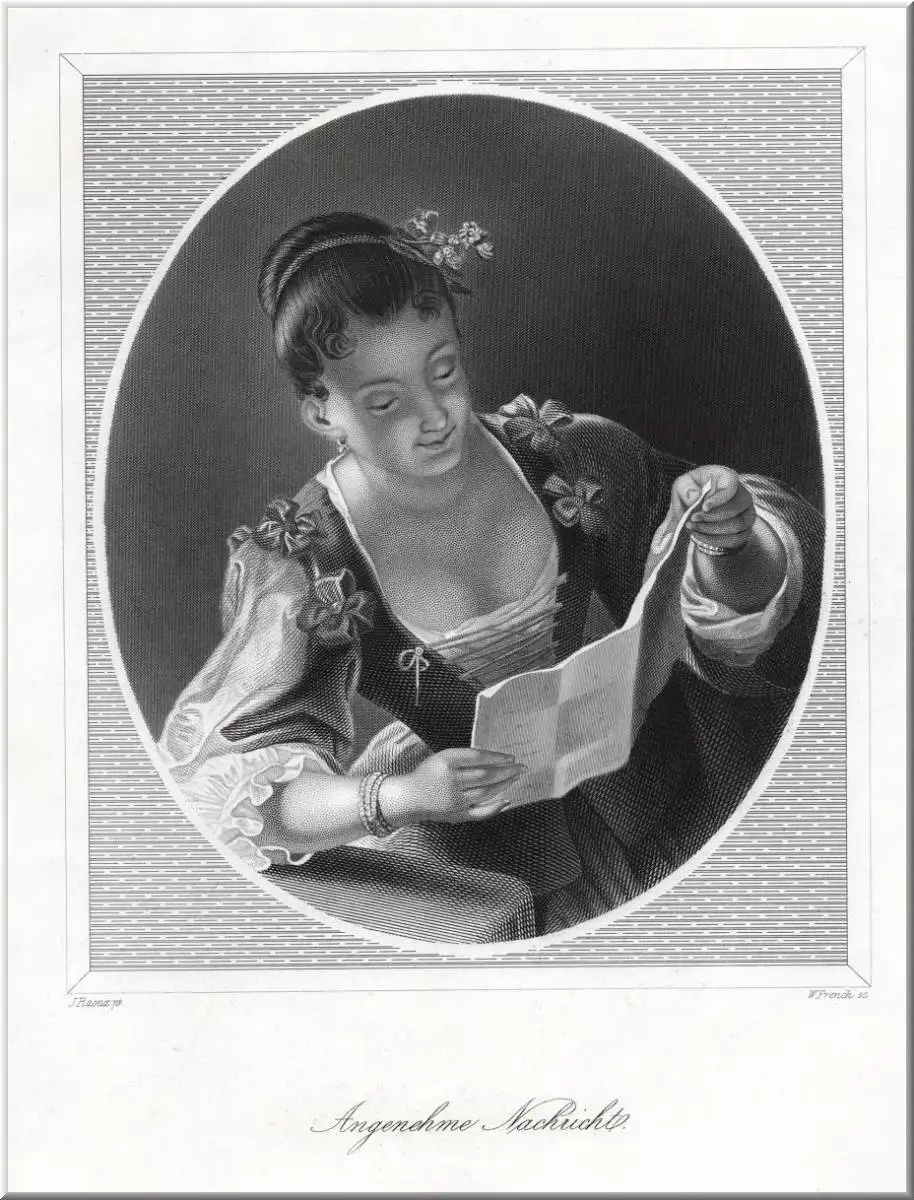 Frauen: Angenehme Nachricht. Originaler Stahlstich von French um 1850
