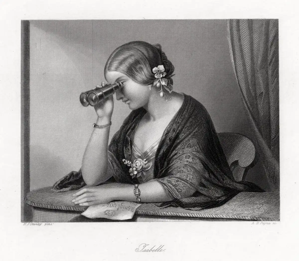 Frauen: Isabelle mit Opernglass. Originaler Stahlstich von Payne um 1850