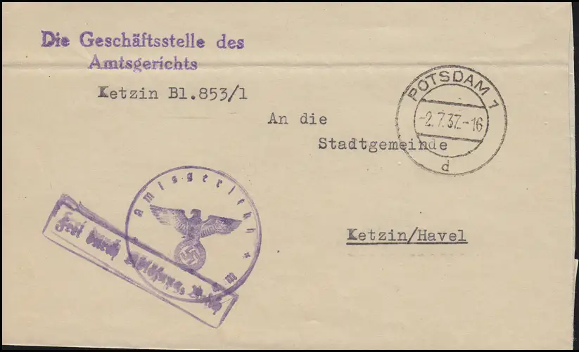 Frei durch Ablösung Reich Amtsgericht Brief POTSDAM 2.7.37 nach Ketzin/Havel