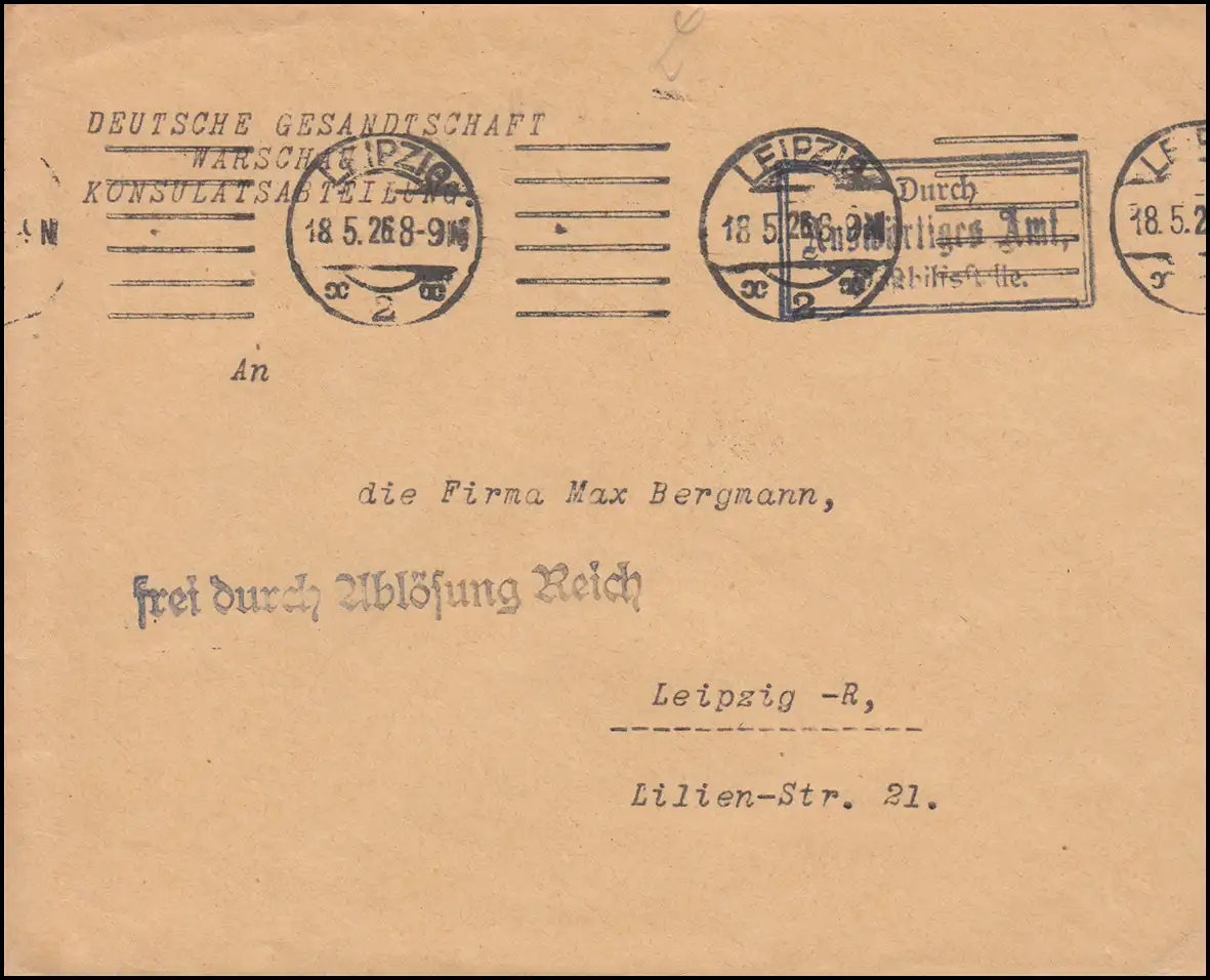 Deutsche Gesandtschaft Warschau Konsulatsabteilung, "Durch Auswärtiges Amt Aushilfsstelle" von LEIPZIG 2 - 18.5.25 als Orts-Brief in die Lilienstraße.