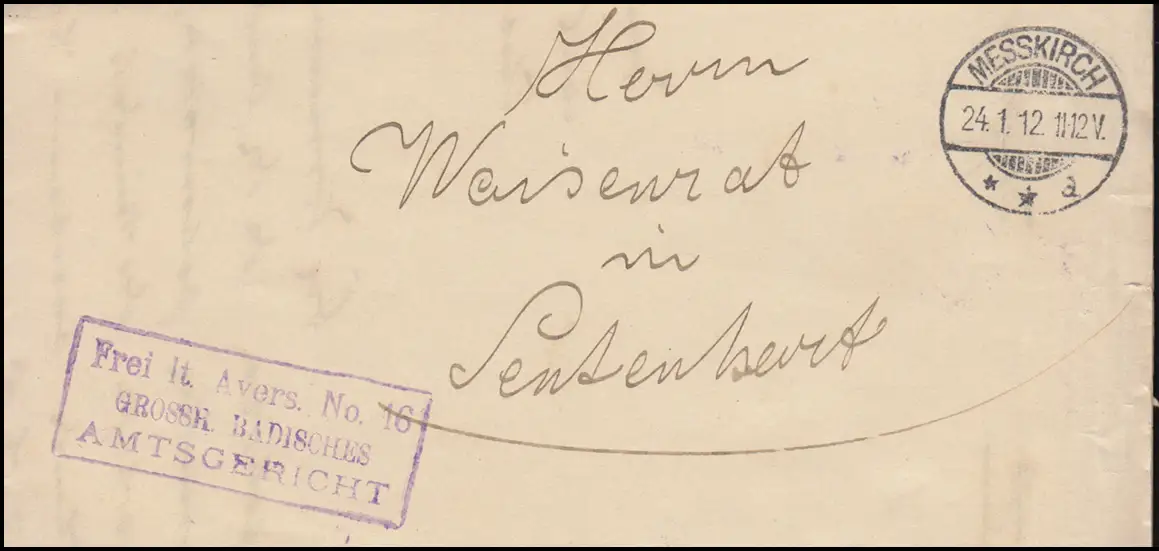 Frei laut Avers No. 16 GROSSH. BADISCHES AMTSGERICHT Brief MESSKIRCH 24.1.1912