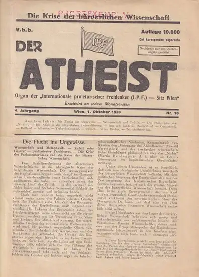 Freidenkerbund Oesterreichs (Hrsg.) / Mayer, Ferdinand (Red.): Der Atheist. Organ der Internationale proletarischer Freidenker (I.P.F.) - Sitz Wien, 4. Jahrgang, 1. Oktober 1930, Nr. 10.