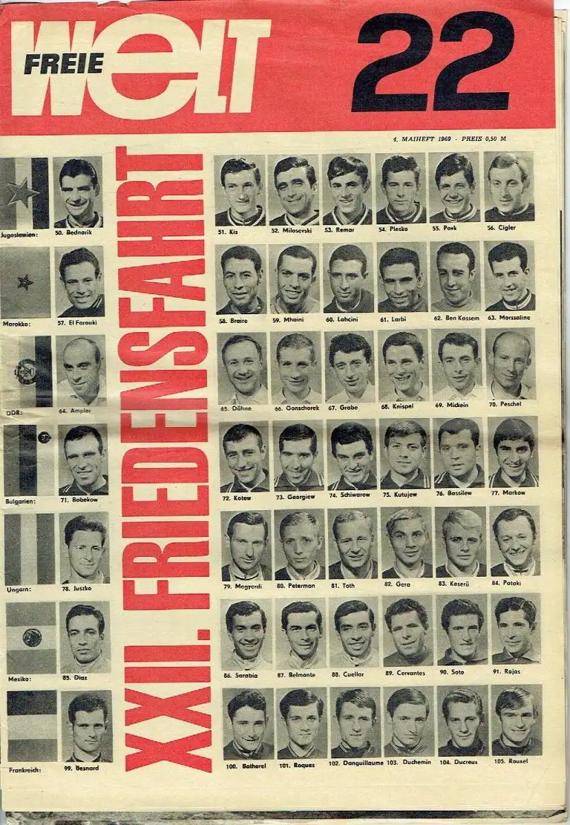 guter bis sehr guter Zustand, geringe Gebrauchs- und Alterungsspuren: Papier teils etwas vergilbt, aber Seiten sauber und ordentlich - teils etwas eselsohrig - kleine Blessuren - mittig quer gefalten, Zeitung der DDR enthält u. a. Reklame, Romane, Kurzerzählungen, Rätsel, Karikaturen, Reportagen, Artikel über DDR-Politik, Sport und Leben, Technik und Wissenschaft, Reportagen aus der deutschen, sowjetischen und internationalen Geschichte und dem Fernsehprogramm der Woche etc. hier zusätzlich auf den beiden Umschlagseiten kleine Fotos aller Teilnehmer der Friedensfahrt, Softcover, ca. 26 x 36 cm, 40 Seiten mit zahlreichen Bildern