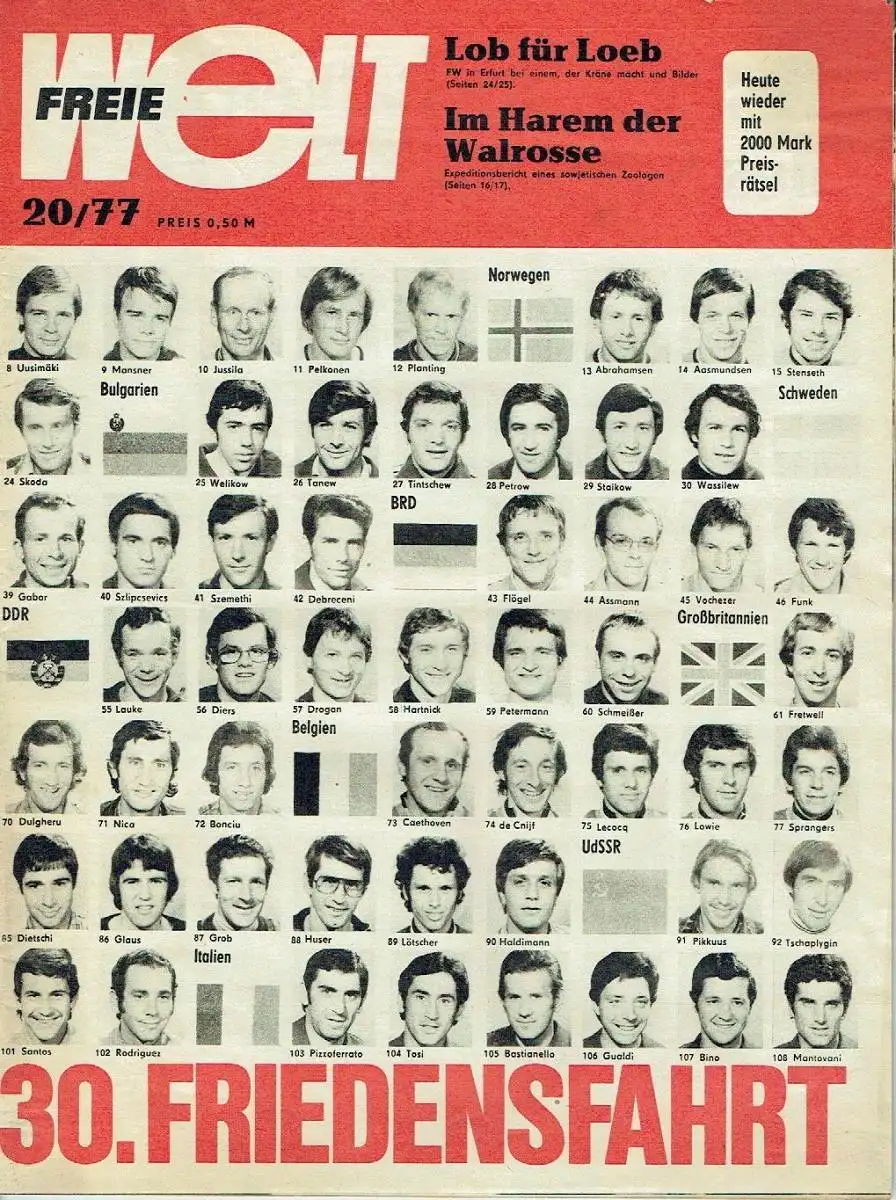 guter bis sehr guter Zustand, geringe Gebrauchs- und Alterungsspuren: Papier teils etwas vergilbt, aber Seiten sauber und ordentlich - teils etwas eselsohrig - kleine Blessuren, Zeitung der DDR enthält u. a. Reklame, Romane, Kurzerzählungen, Rätsel, Karikaturen, Reportagen, Artikel über DDR-Politik, Sport und Leben, Technik und Wissenschaft, Reportagen aus der deutschen, sowjetischen und internationalen Geschichte und dem Fernsehprogramm der Woche etc. hier zusätzlich auf den beiden Umschlagseiten kleine Fotos aller Teilnehmer der Friedensfahrt, Softcover, ca. 26 x 36 cm, 40 Seiten mit zahlreichen Bildern