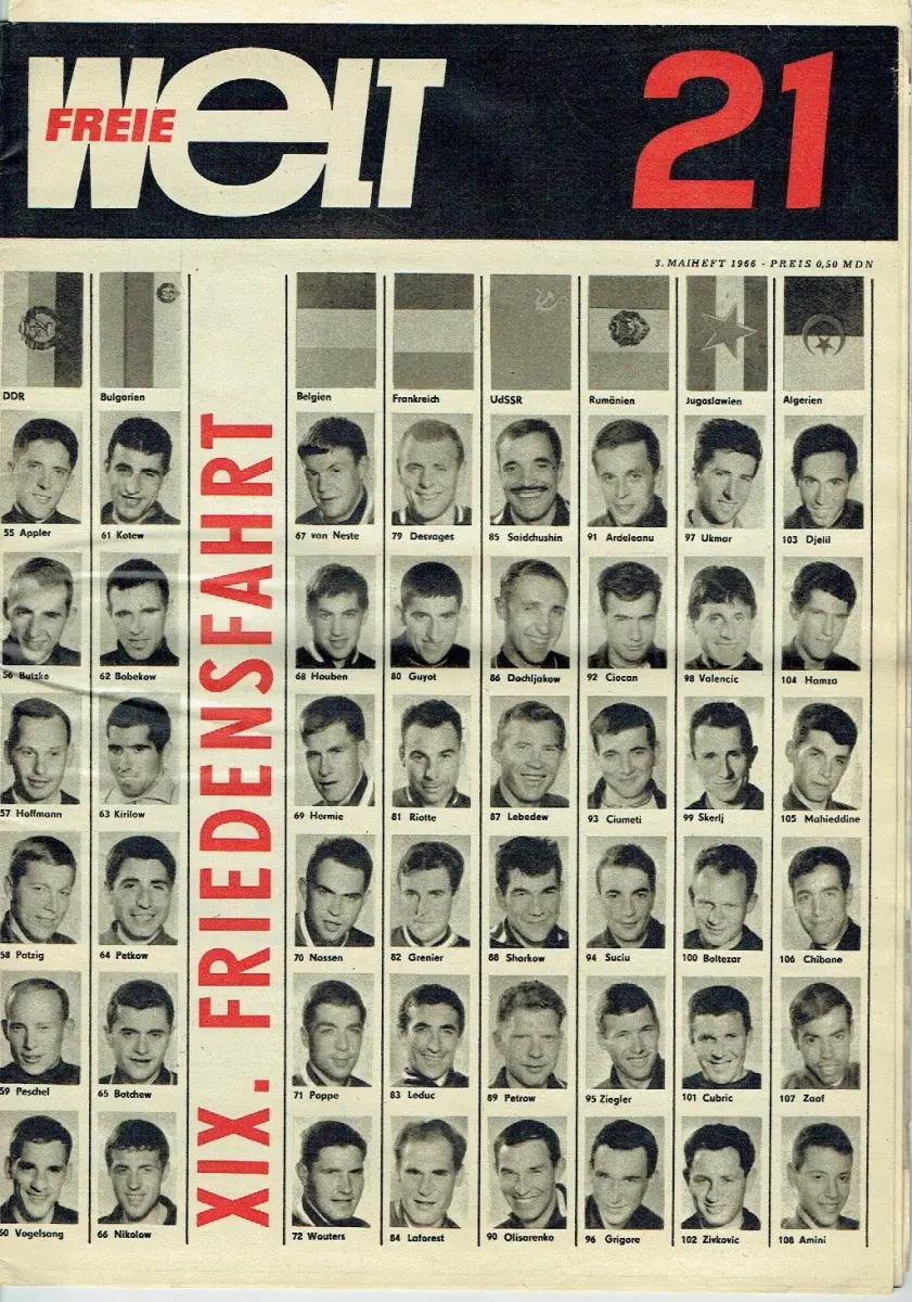 guter bis sehr guter Zustand, geringe Gebrauchs- und Alterungsspuren: Papier teils etwas vergilbt, aber Seiten sauber und ordentlich - teils etwas eselsohrig - kleine Blessuren - mittig quer gefalten, Zeitung der DDR enthält u. a. Reklame, Romane, Kurzerzählungen, Rätsel, Karikaturen, Reportagen, Artikel über DDR-Politik, Sport und Leben, Technik und Wissenschaft, Reportagen aus der deutschen, sowjetischen und internationalen Geschichte und dem Fernsehprogramm der Woche etc. hier zusätzlich auf den beiden Umschlagseiten kleine Fotos aller Teilnehmer der Friedensfahrt, Softcover, ca. 26 x 36 cm, 40 Seiten mit zahlreichen Bildern