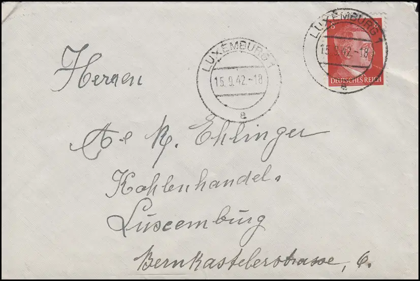 Freimarke Hitler 8 Pf EF auf Orts-Brief Kohlenhandlung Arelux LUXEMBURG 15.9.42