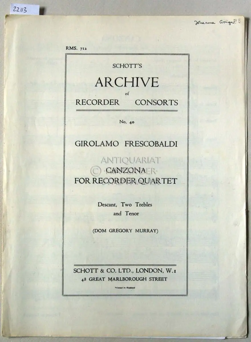 Frescobaldi, Girolamo: Canzona for Recorder Quartet. Descant, Two Trebles and Tenor (Dom Gregory Murray). [= Schott`s Archive of Recorder Consorts, No. 40; RMS. 712].