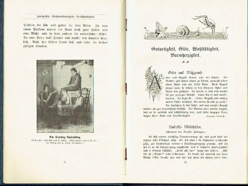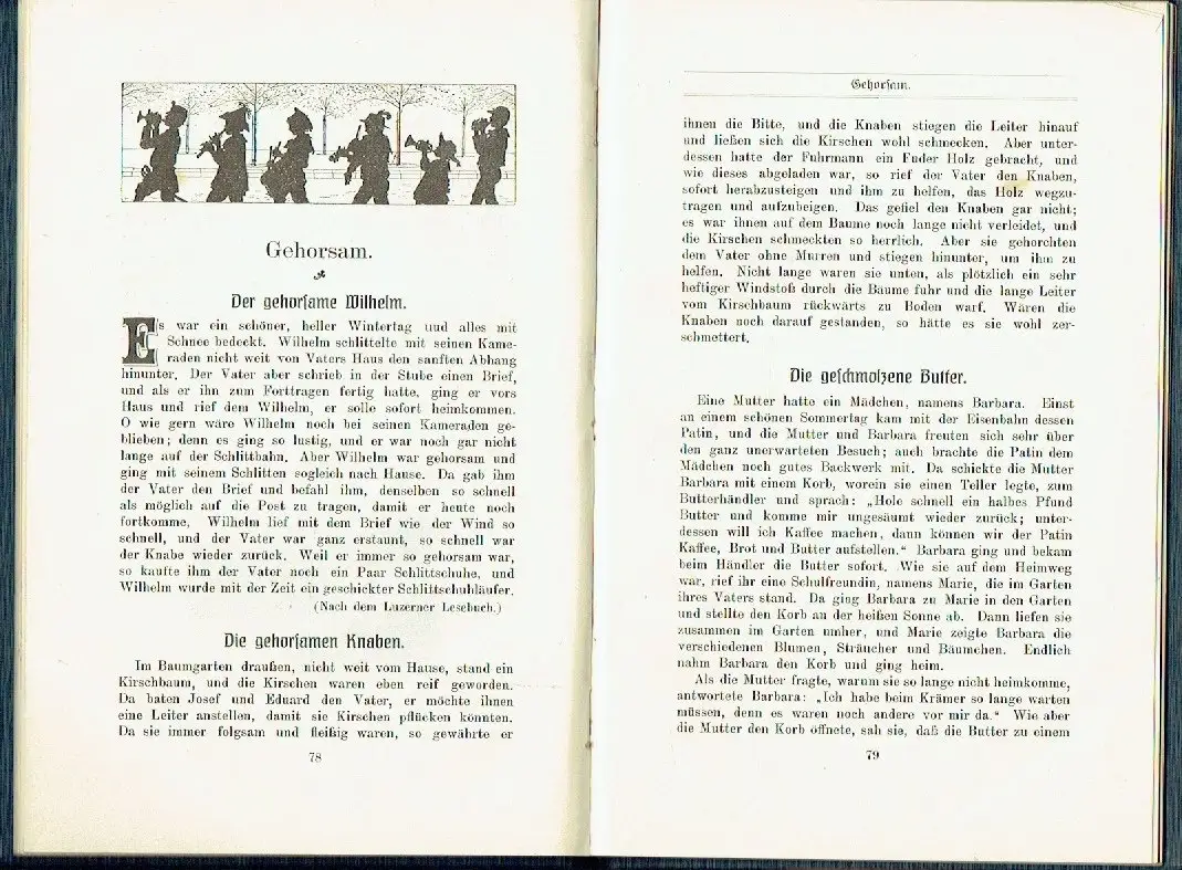 guter Zustand, geringe Gebrauchs- und Alterungsspuren: Einbandecken gering abgenutzt / leicht gestaucht - Rückenoberkante minimal ausgefranst - alter Besitzereintrag innen im Deckel - Vorsätze vergilbt - Seiten sauber und ordentlich, sehr selten gering fleckig - Seiten teils etwas eselsohrig, Der Gemütsbildung unserer lieben Jugend ist das vorliegende Werklein gewidmet. Dieser Aufgabe kommt gerade in den ersten Schuljahren mehr als in irgend einer andern Zeit des Lebens eine besonders hervorragende Bedeutung zu. Die Anlagen zu einer gesunden Entwicklung des Kindergemüts, so ungleich sie auch verteilt sein mögen, sind wohl immer vorhanden; aber diese guten Keime im zarten Kinderherzen müssen liebevoll gepflegt und zur Entfaltung gebracht werden. Das gute Beispiel ist, wie wir wissen, das beste und zuverlässigste Erziehungsmittel. Aber auch die erzählende Vorführung von nachahmenswerten nnd abschreckenden Beispielen kann einen bildenden Einfluß auf Gemüt und Charakter ausüben, und manches edle Saatkorn, das auf diese Weise ins jugendliche Herz gelegt wird, entfaltet sich unter der treuen Obhut von Eltern und Lehrern zu schöner Blüte. Die kleine Sammlung von Erzählungen, die ich hier biete, ist nun zunächst dazu bestimmt, Lehrern und Lehrerinnen an der Unterstufe der Volksschule Erzählstoff an die Hand zu geben, die sich in denjenigen Unterrichtsstunden, die speziell der sittlich-religiösen Bildung gewidmet sind, verwenden lassen. Der Stoff ist nach Form und Inhalt dem Verständnis und der Vorbildung der Kinder möglichst angepaßt. Die wenigen mundartlichen Einlagen sollen eine wohltuende Abwechslung in die ernst gehaltenen Erzählungen bringen und die gesunde Fröhlichkeit im Kindesgemüte pflegen. Um einer gewissen Übersicht und Planmäßigkeit Rechnung zu tragen, ist der Stoff nach bestimmten Gesichtspunkten zusammenstellt. Den Schluß des Büchleins bilden eine Unzahl Erzählungen gemischten Inhalts, bei denen absichtlich von einer bestimmten Einteilung abgesehen wurde. Doch nicht bloß in der Schule, sondern auch im Elternhause, wo man darauf bedacht ist, dem Kinde einen passenden, guten Lesestoff zu verschaffen, hofft das Büchlein wohlwollende Aufnahme zu finden und dem jugendlichen Leser an den langen Winterabenden ein vertrauter Freund zu werden. Die Mehrzahl der Erzählungen sind Originalerzählungen des Verfassers selbst. Einige von anderer Seite mir zugekommene Originalbeiträge verdanke ich hiemit bestens. Außerdem finden sich einige Nummern, die vielleicht als »alte Bekannte« erscheinen. Für die mir freundlichst erteilte Erlaubnis zur Aufnahme derselben in vorstehende Sammlung, spreche ich an dieser Stelle nochmals meinen verbindlichen Dank aus. Bei einzelnen andern Nummern, die der Vollständigkeit halber und um ein abgeschlossenes Ganzes zu bilden, ebenfalls aufgenommen wurden, konnte ich leider die Quellen nicht mehr anführen; es betrifft namentlich solche Erzählungen, die ich mir zu einer Zeit notierte, da ich noch nicht an die Herausgabe einer solchen Sammlung dachte; ich bitte in diesen Fällen um gütige Nachsicht, Leinen, ca. 13,5 x 20, 128 Seiten mit einigen Bildern