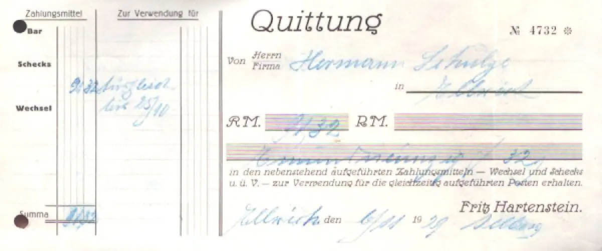 Fritz Hartenstein Erfurt Grosshandlung Quittung 1929-1932