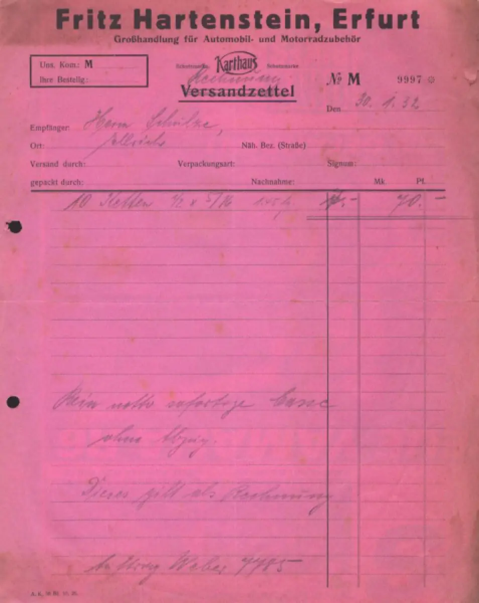 Fritz Hartenstein Erfurt Grosshandlung Versandzettel / Rechnung 1932