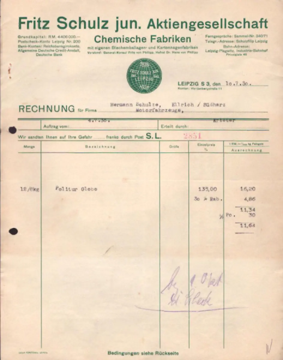 Fritz Schulz jun. AG Leipzig Rechnung 1930