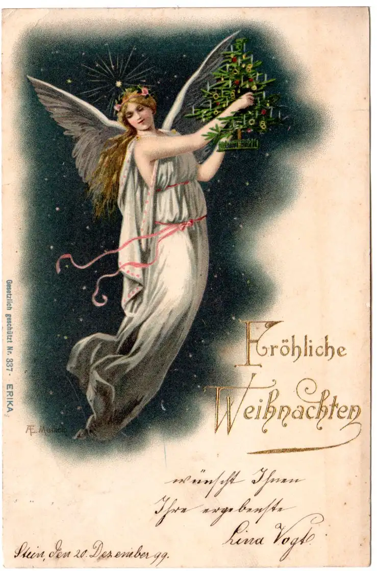 Fröhliche Weihnachten m. Christbaum u. Engel, 1899 gebr. Farb-AK