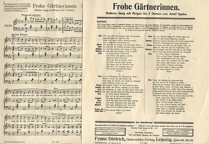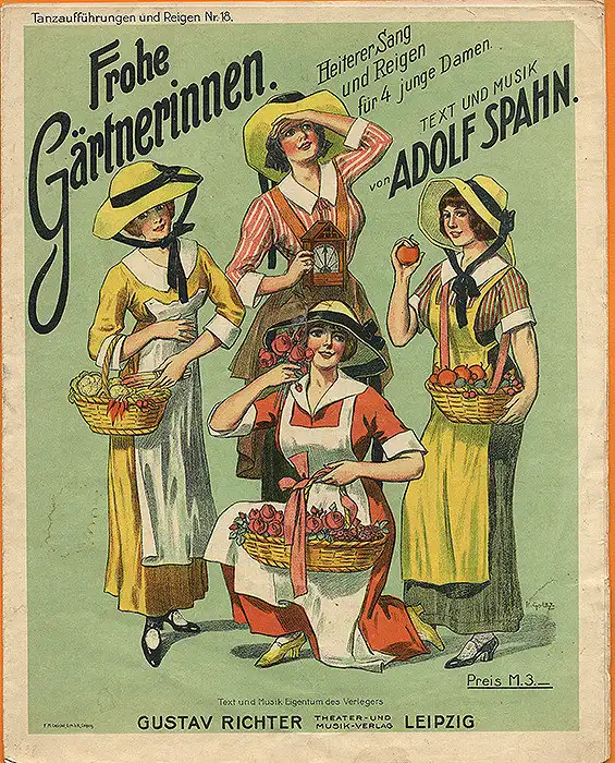 Frohe Gärtnerinnen ein heiteres Tanz und Singspiel für 4 junge Damen Text und Musik von Adolf Spahn sehr schöne farbige Titelgrafik Textblatt mit Noten Theater und Musikverlag Gustav Richter Leipzig um 1901