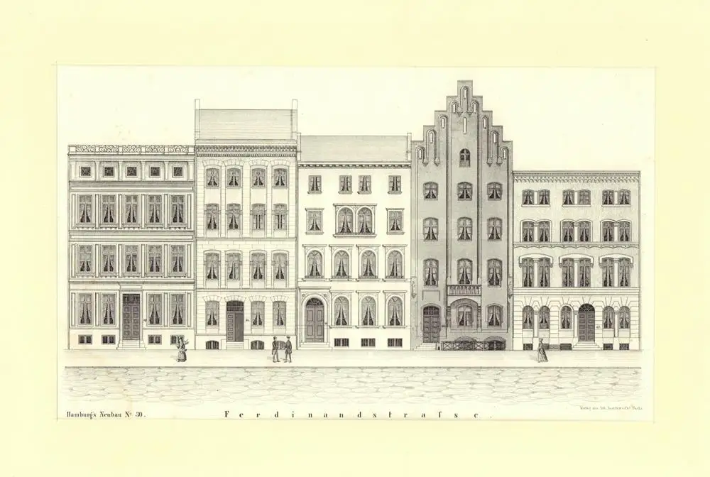 Details der Facaden von den vorzüglichsten Gebäuden aus Hamburgs Neubau, hier die damaligen Hausnummern 59-67, meist reine Wohnhäuser, eines im neugotischen Stil; an der Ecke zur Reimersbrücke die Firma Schulte & Scheumann. - Etw. stockfleckig, linke untere Ecke wasserrandig