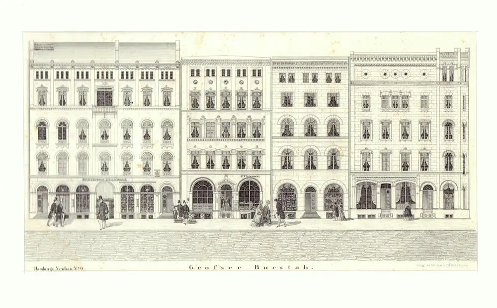 Details der Facaden von den vorzüglichsten Gebäuden aus Hamburgs Neubau, hier die damaligen Hausnummern 4 - 10, teils ohne Firma; die anderen sind: C. Thiemer; Fehr & Kortmann u. Schenk & Dirks. - Etw. stockfleckig, linke untere Ecke nässerandig