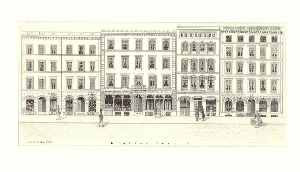Details der Facaden von den vorzüglichsten Gebäuden aus Hamburgs Neubau, hier die damaligen Hausnummern 30 - 38 : Georg Winter jun. (Stoffe) u. Joachim Meyer sen. & Sohn (Haartuch & Krollhaar-Fabrik), Lavy (Schirme), Murck & Roscher (Tapeten-Handlung) u. Maschmann (Papier-Handlung), J. F. Göbel (Hut-Fabrik), Möller (Schneidermeister) u. L. Marcus jun. - Etw. stockfleckig, mit vereinzelten kl. Knitterfalten