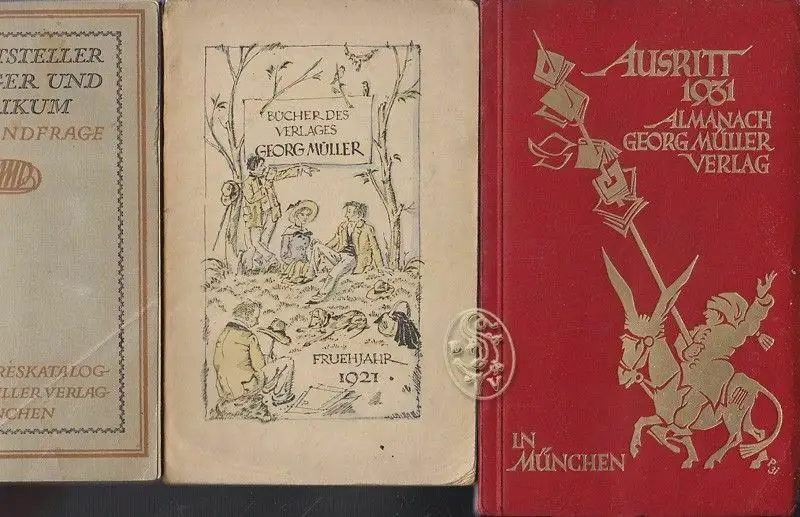 Bemerkungen: Enthält ein vollständiges Verlagsverzeichnis, Vergriffene Bücher sind gekennzeichnet - Beilagen: 1: 1903 - 1908. Katalog der in den ersten fünf Jahren des Bestehens erschienenen Buecher. Mit Vorv. v. G. Müller, literarischen Selbstcharakteristiken von Otto Julius Bierbaum, Anna Croissant-Rust, Hanns H. Ewers, Wilh. Fischer in Graz, Rudolf Huch, Richard Schaukal, Johannes Schlaf, Wilh. von Scholz, August Strindberg, Wilh. Weigand und anderen Originalbeiträgen. Mit den Bildnissen der Autoren und vielen anderen Illustrationen. Mchn./Lpz. 1908. 8°. 160 S., 3 Bll., Mit 20 Taf. u. mehreren Abb. im Text OBrosch. Tit. gestemp. u. m. hs. Widmung. - 2: Schriftsteller, Verleger und Publikum. Eine Rundfrage. Zehnjahreskatalog. Mchn., Georg Müller [1913]. 8°. 2 Bll., 128 S. OBrosch. Einbd. gestemp. u. m. Knick. - 3.: Bücher aus dem Verlage Georg Müller. Mchn., Georg Müller 1921. kl.-8°. 151 S. Mit mehreren Abb. u. farb. Einbandillustr. - 4.: Ausritt 1931. Almanach des Georg Müller Verlages in München. Mchn., Georg Müller 1931. kl.-8°. X, 269 (1) S. Mit photogr. Portr. auf 12 Taf. OKart. Mit Einbandillustr. v. Emil Preetorius.