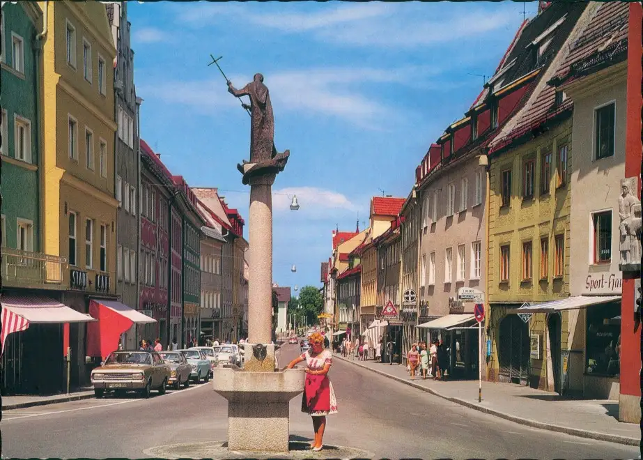 Füssen Reichenstrasse, div. Auto Autos Modelle, Frau am Brunnen 1970
