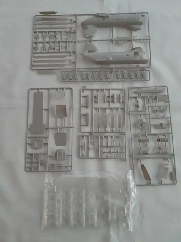 Einzelteile (Plastikbauteile) sind noch am Rahmen fixiert, Sichthülle wurde geöffnet.