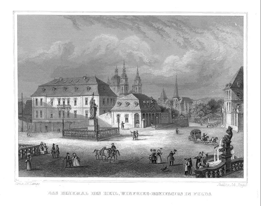 Fulda- Denkmal des heiligen Bonifacius Originaler Stahlstich (Poppel) um 1850