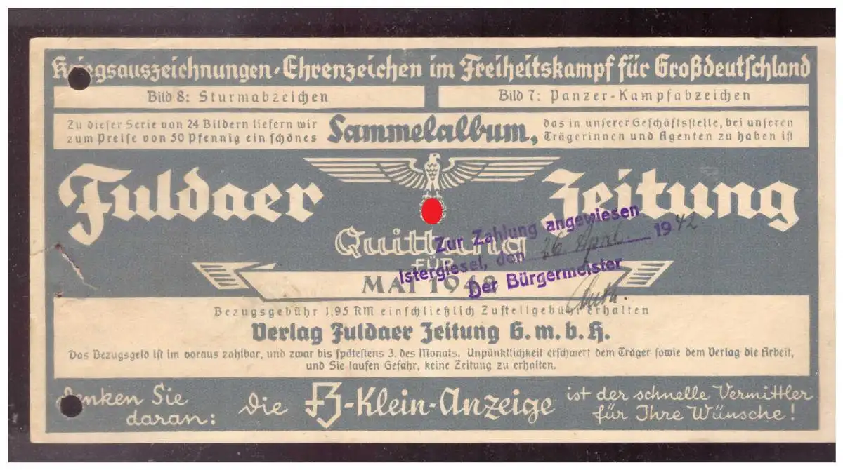 Freie Bezeichnung: Dt.- Reich (020055) Propaganda Sammelbilder Fuldaer Zeitung Quittung für Mai 1942 mit Stempel Zahlungsanweisung