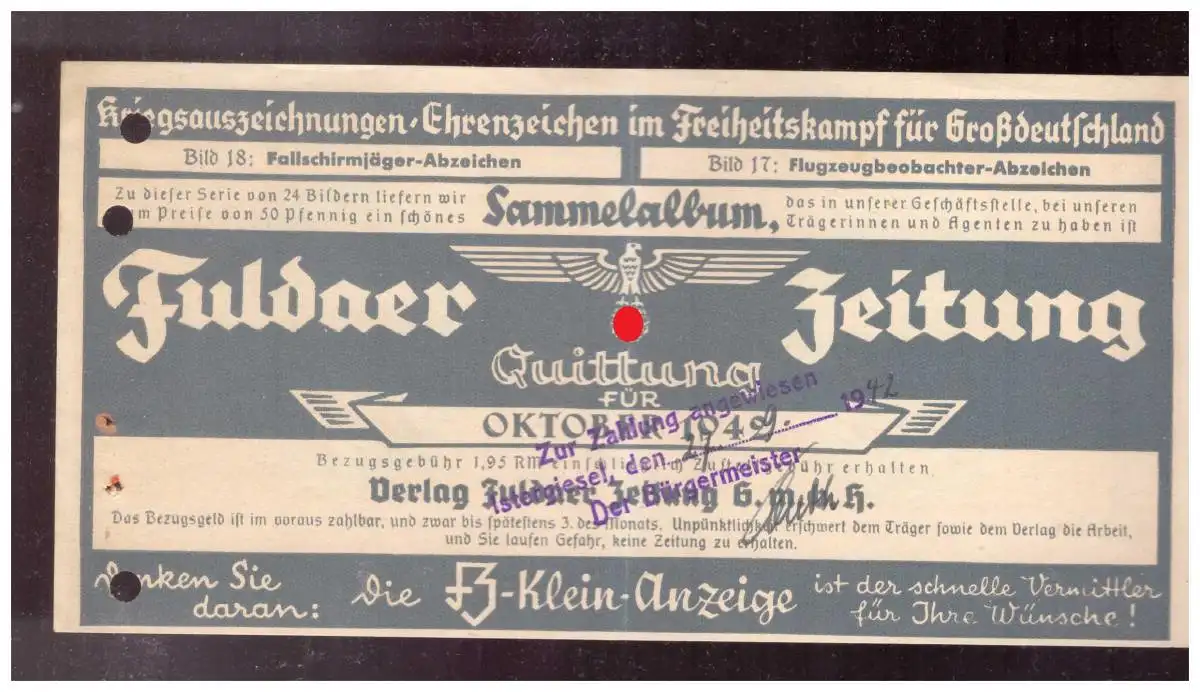 Freie Beschreibung: Dt.- Reich (020060) Propaganda Sammelbilder Fuldaer Zeitung Quittung für Oktober 1942 mit Stempel Zahlungsanweisung