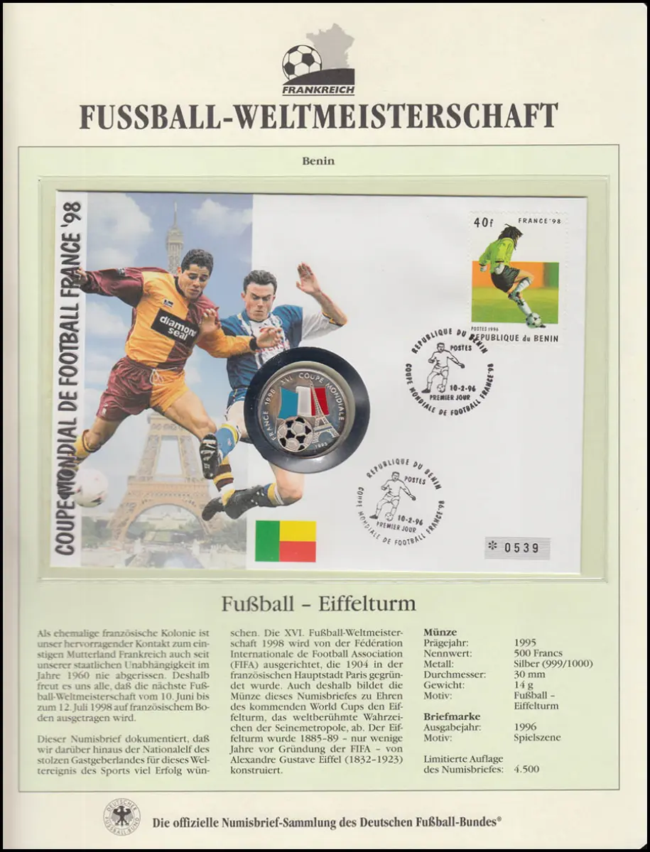 Fußball-WM 1998 Frankreich - Farb-Numisbrief Eiffelturm, Silber 999, 14g