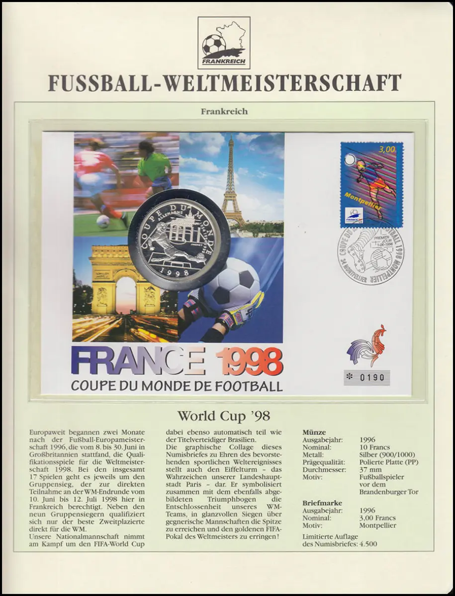 Fußball-WM 1998 Frankreich - Numisbrief Brandenb. Tor, Silber 900, 37mm