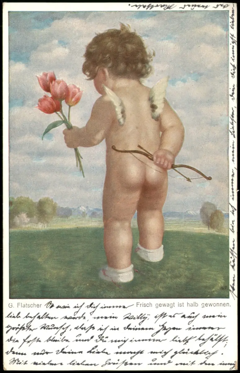 Name: G. Flatscher Künstlerkarte Kind nackt mit Amor-Pfeilen u. Bogen