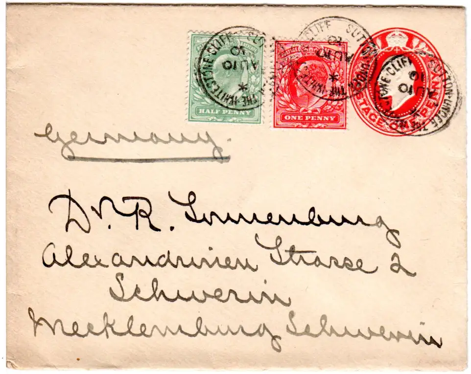 GB 1910, 1/2+1d Zusatzfr. auf 1d Ganzsache Brief v. Sutton n. Mecklenburg