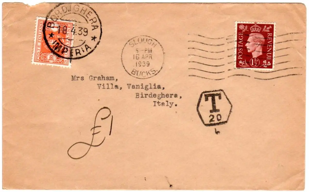 GB 1939, 1 1/2d auf Brief v. Slough m. T-Stpl. u. Italien 1 L. Portomarke