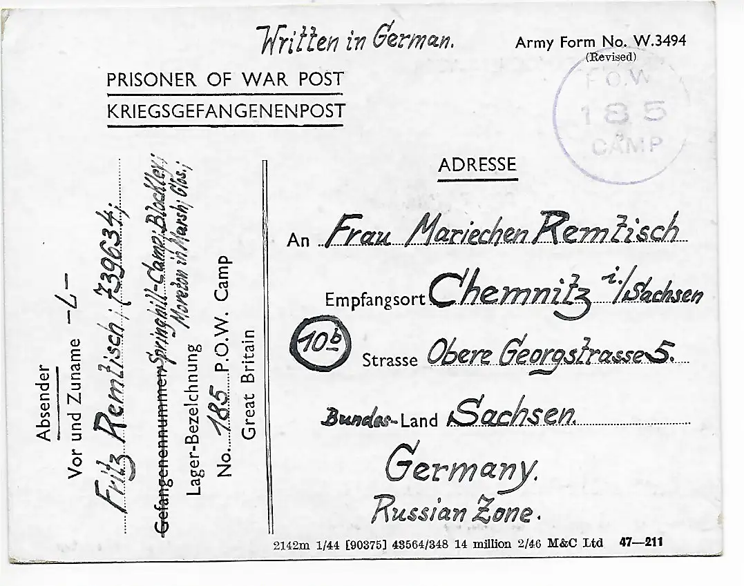 GB: Kgf/PoW: #185 Springhill Camp Blockley to Chemnitz, 1947