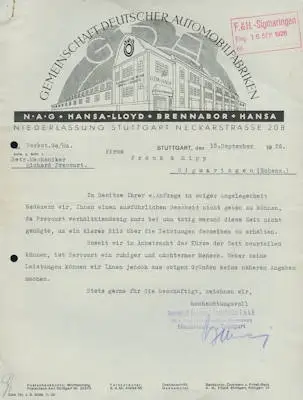 1 Seite DinA4 GDA Niederlassung Stuttgart NAG Hansa-Lloyd Brennabor Hansa Guter Zustand, gelocht