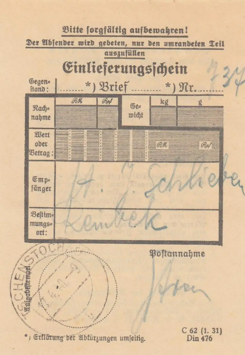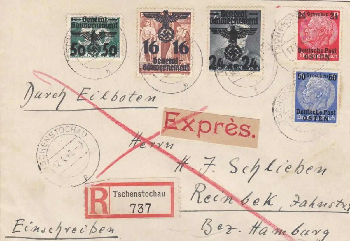 GG: #38 MiF, Einschreiben Tschenstochau mit Einlieferungsschein nach Reinbek