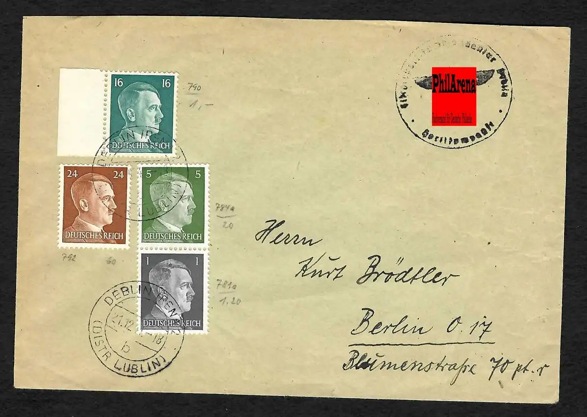 Brief von 1941 nach Berlin. Die Marken hatten eigentlich keine Frankaturkraft und wurden trotzdem entwertet. Vermutlich wurde der Brief als Feldpost behandelt.