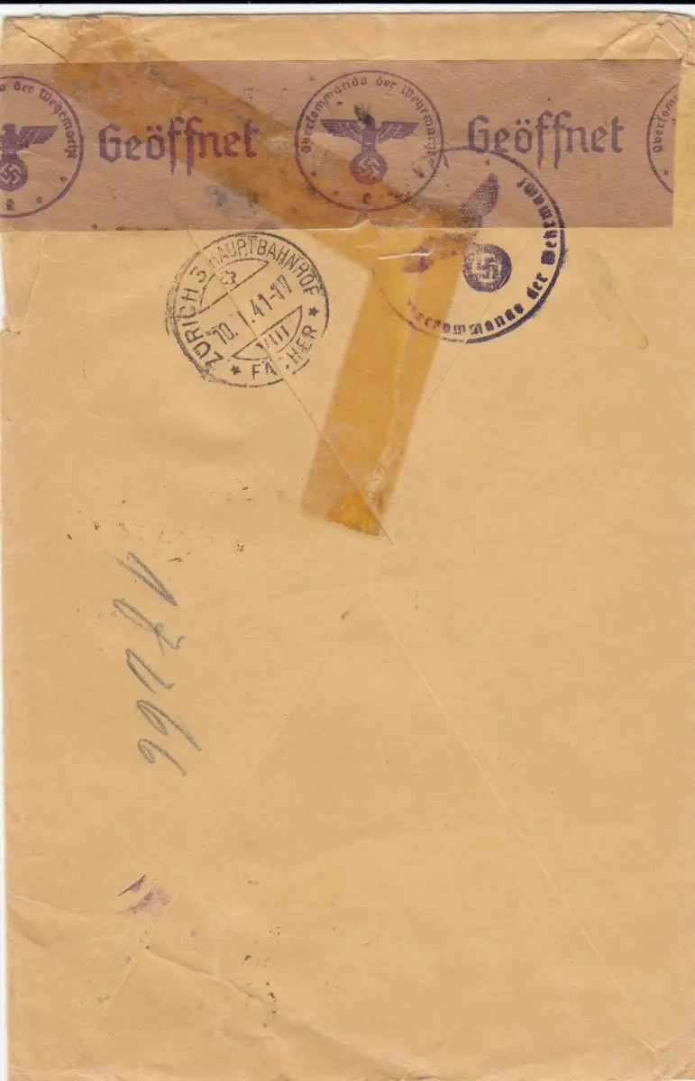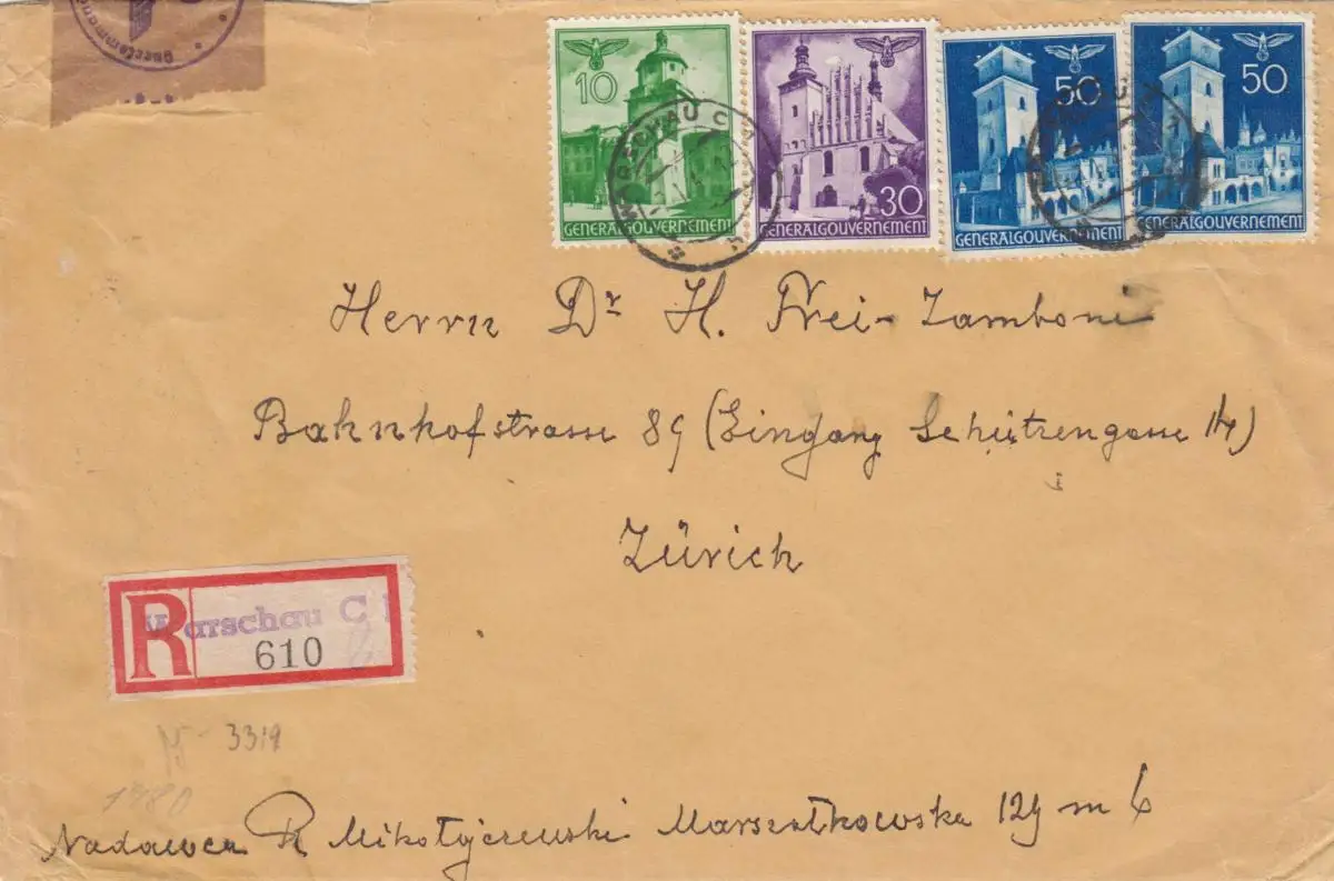 GG: CH: Einschreiben Warschau nach Zürich, 2. Gew. Stufe, portogerecht, Zensur