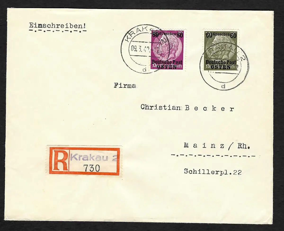 GG: Einschreiben Brief 93.40: portogerecht Krakau nach Mainz