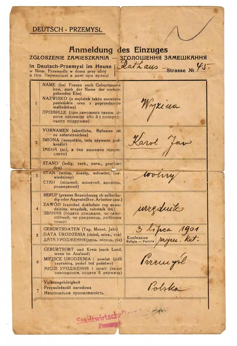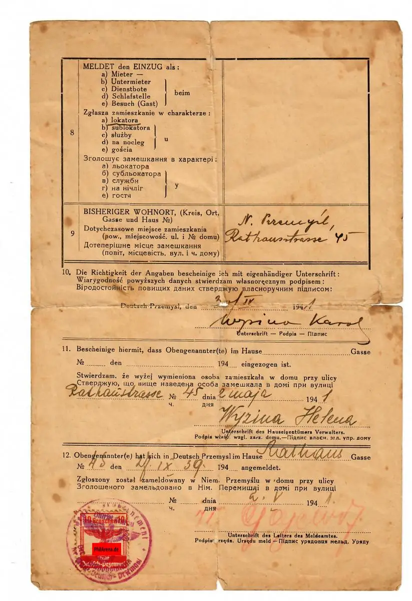 GG: Gebührenmarke der Stadt Deutsch-Przemysl auf Anmeldung Einzug 1941