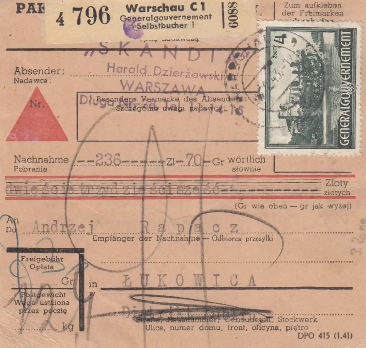 GG Inlandspaketkarte Warschau: Selbstbucher, Nachnahme, Sperrgut nach Lukowica