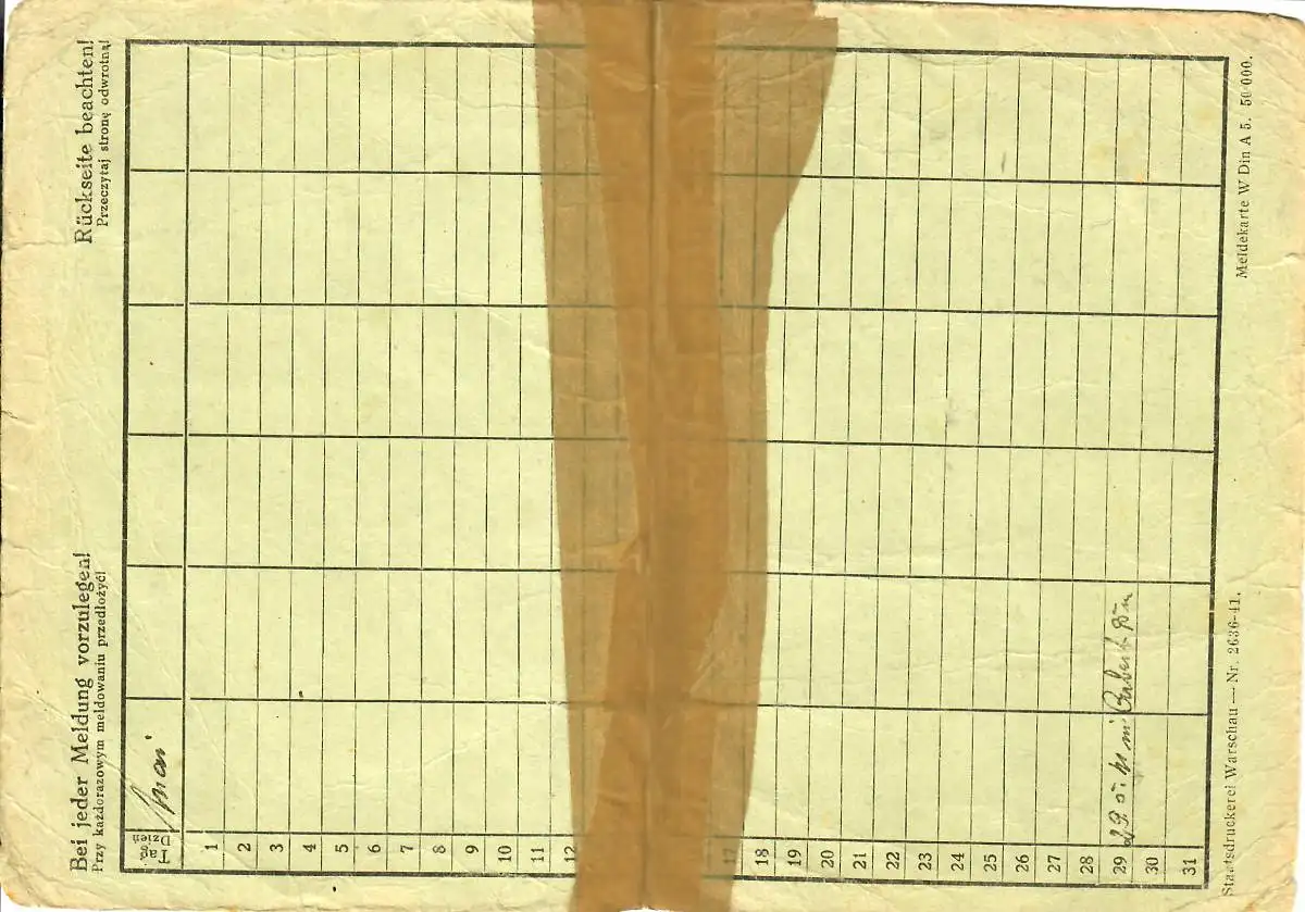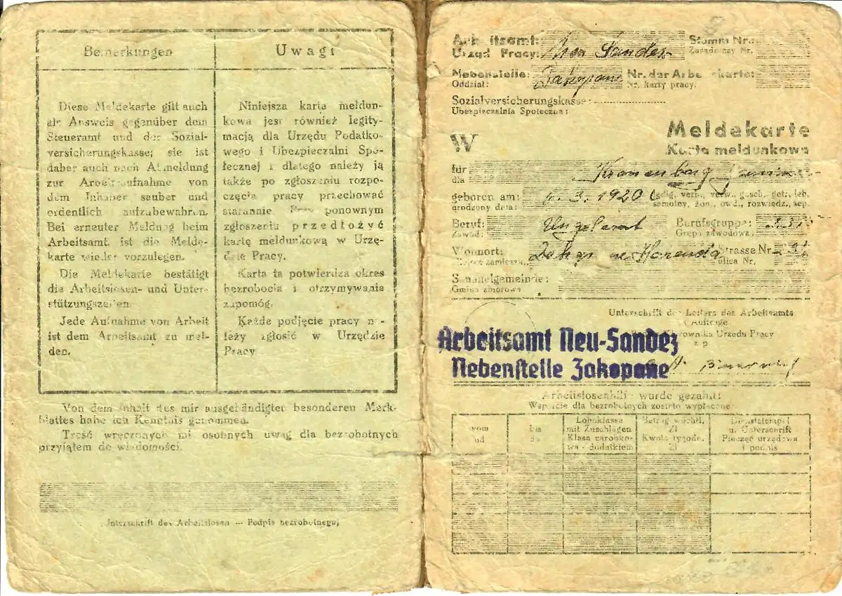 GG: Meldekarte -W- Arbeitsamt Neu Sandez, Nebenstelle Zakopane, ungelernter
