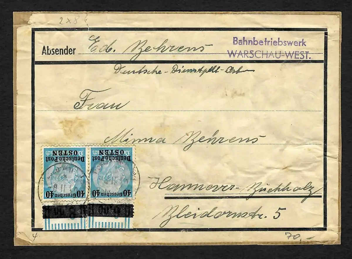 GG: Päckchen Warschau-West nach Hannover, MiNr. 8, MeF, 8.2.40