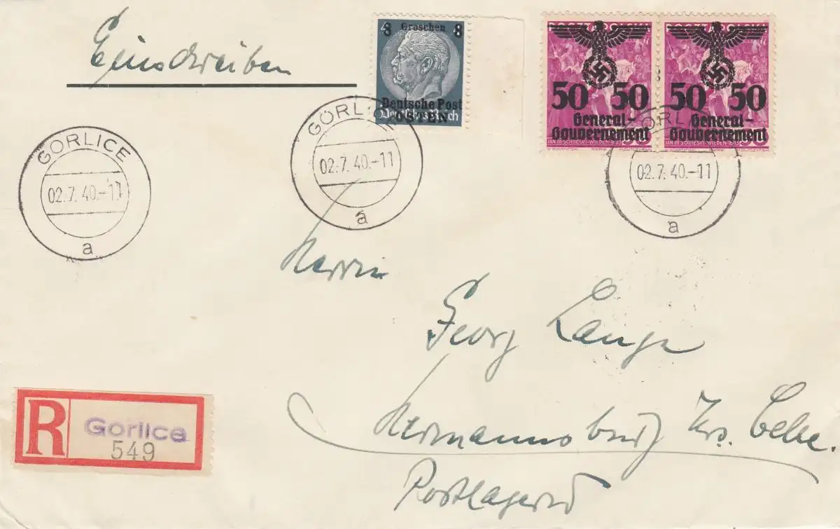 GG: Portogerechter Einschreibebrief von Gorlice nach Hermansburg, 2. Gew. Stufe