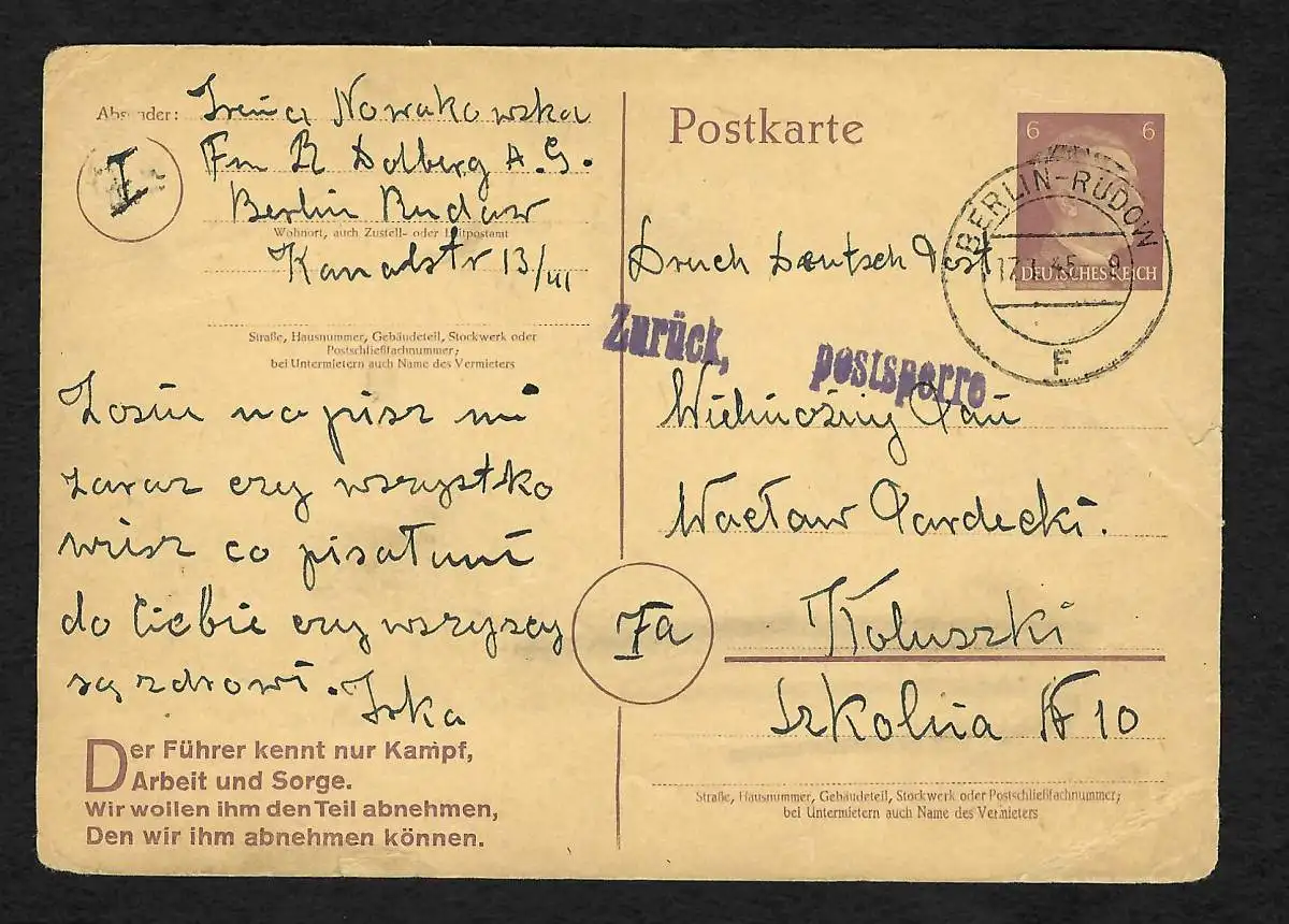 GG: Postkarte 17.1.45 von Berlin nach Koluszi, zurück Postsperre