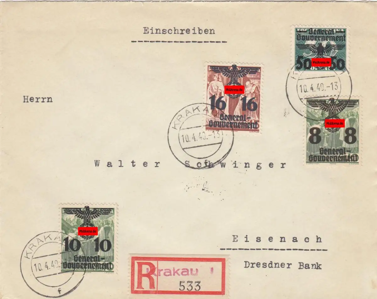 GG: Seltene MiF mit MiNr. 37 auf portogerechtem Brief von Krakau nach Eisenach