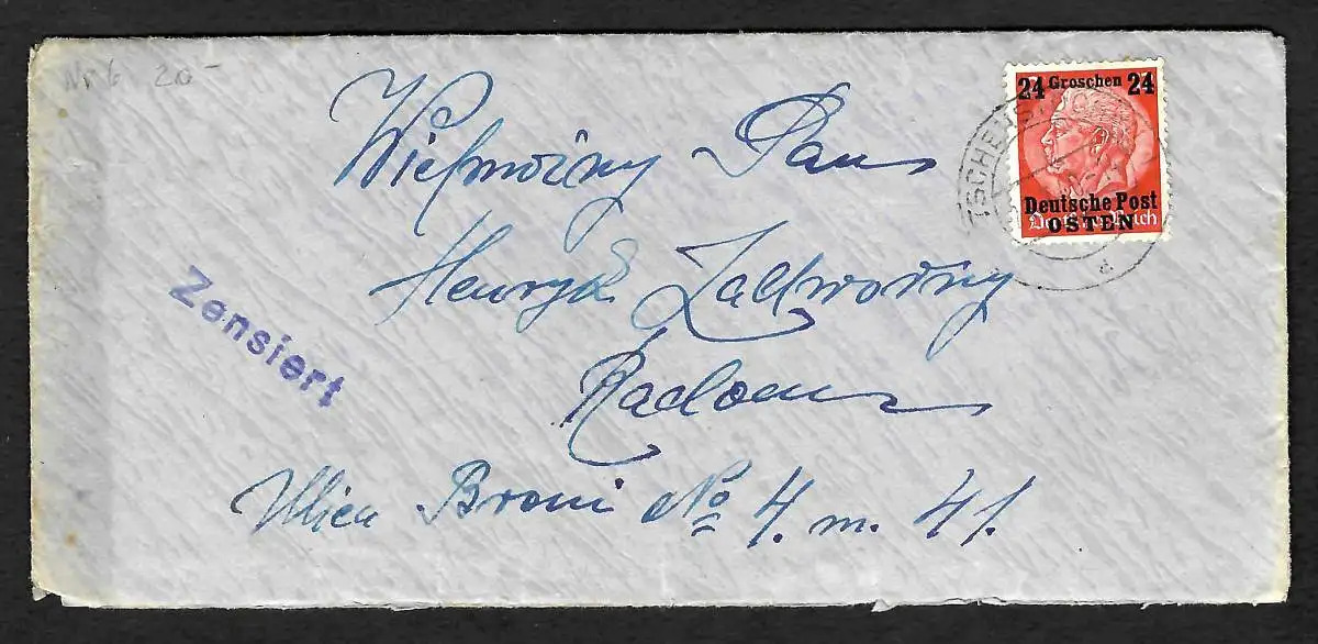 Für mehr Informationen siehe Scan: Dieser Brief ging über keine Auslands-Briefprüfstelle. Nach den Forschungen der ArGe Generalgouvernement wurden nur Briefe aus Gefängnissen zensiert, Briefe an oder von bestimmten Familien vom SD zensiert. Diese haben jedoch andere Vermerke zusätzlich. Es sind wenige Briefe mit Zensurmerkmalen bekannt, deren Zensur noch nicht erklärbar sind. Für Hinweise wäre ich dankbar. Brief ist mit Briefinhalt.
