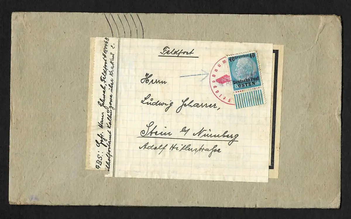 GG: Zollfreie - Feldpost - Monatssendung nach Nürnberg, MiNr. 8, EF