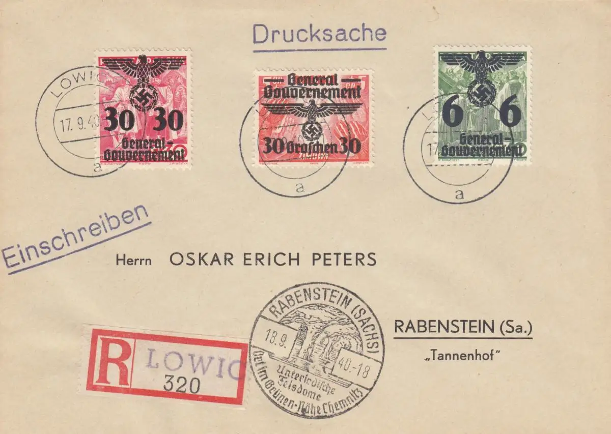 GG:portogerechte Drucksache als Einschreiben, Lowicz nach Rabenstein,selt. Porto