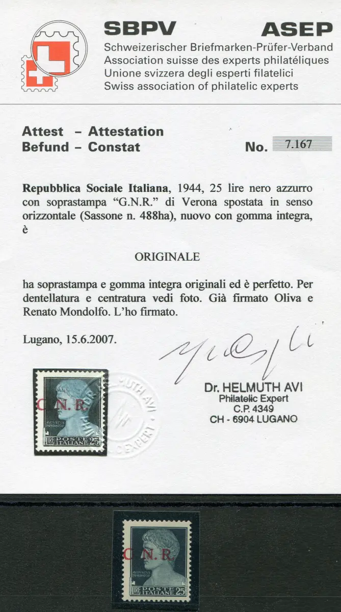 G.N.R. Lire 25 Verona mit stark verschobenem Aufdruck Vollgummi - G.N.R. Lire 25 Verona Nr. 488hb schönes Exemplar mit stark nach links verschobenem Aufdruck - Selten - R. Mondolfo und Cert. H. AVI - Kat. euro 3.800 Cod. 204/L