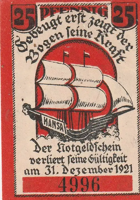 0-8900 GÖRLITZ, Notgeld 25 Pfennig 1921, Hanse - Kogge