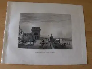 GRAVURE (AQUATINTA) ORIGINALE : BARRIERE DE PASSY - d`apres (nach) SCHMIDT - gravee (gestochen von) par MARTENS. Mit d. Seine, Quais, Kühe, Karren, Beleuchtung, Schiffe, Händler.